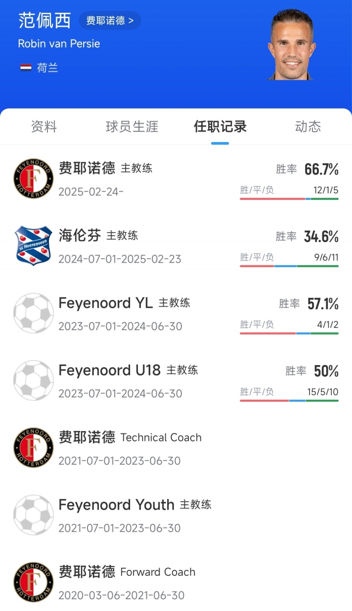 现年42岁的范佩西球员活命曾遵守阿森纳、曼联等多支球队,2019年35岁的范佩西退役,随后加入费耶诺德栽培组,先后担任前卫栽培,后生队栽培等职务。2025年2月,范佩西出任费耶诺德主帅,合手教于今获取12胜1平5负的战绩。